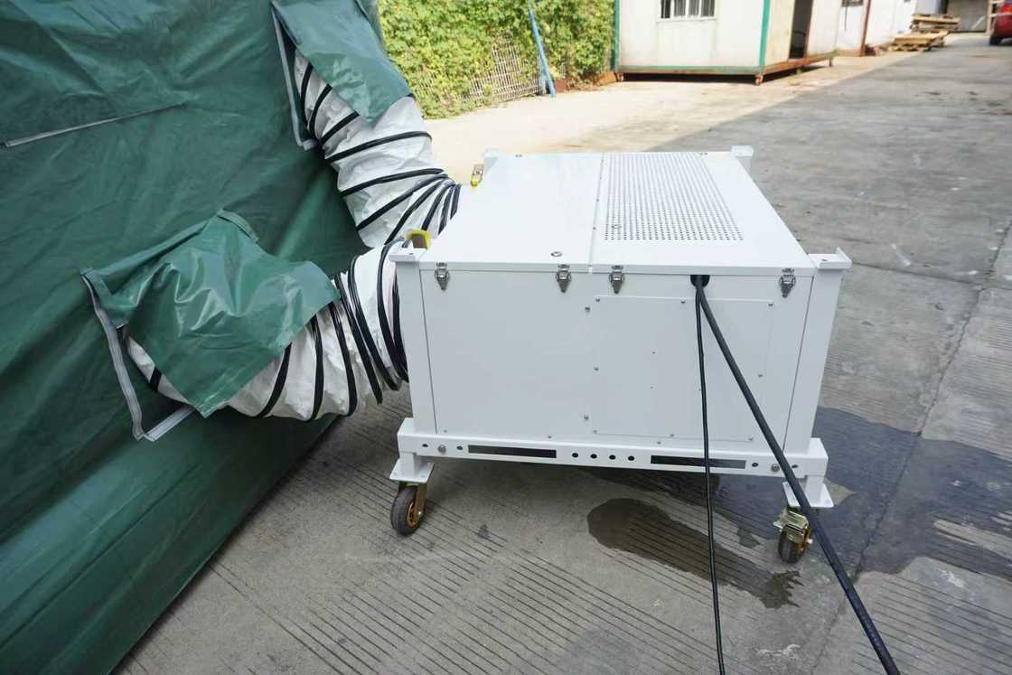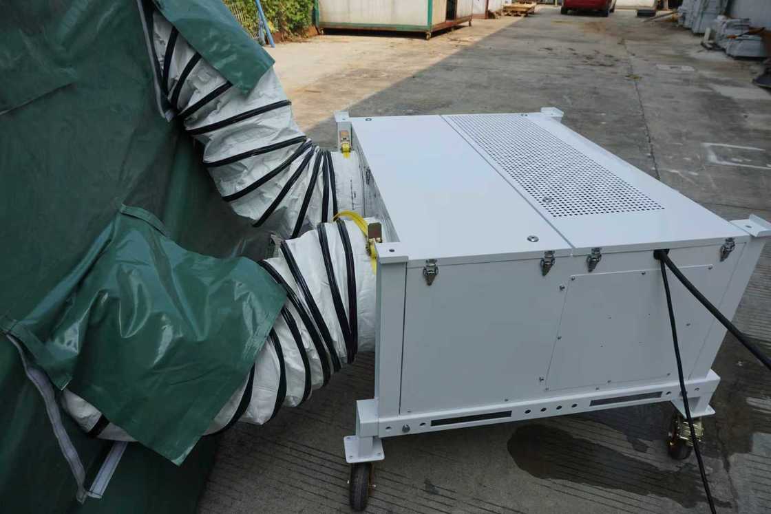weather damage. The tent air conditioner is fitted with flexible duct and the unit itself must